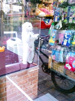 池袋教室の近所のペットショップには白いワンコが立ってお出迎え。