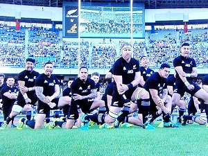 さあ、いよいよキックオフの15時が近づいてきました。両国の選手入場、国歌斉唱、そしてオールブラックスによるマオリ族の民族舞踊「ハカ」が披露されると、会場の盛り上がりは最高潮に。