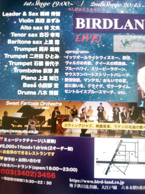 小規模なライブハウスのバードランドでのコンサートなので、リーダー兼サックス奏者の篠崎さんらメンバー12名。内訳は