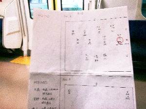 さて、この日は生徒の皆さんにご協力頂いて私は戸塚本部スタジオでのY'sナンバーのお稽古に参加です。寒さからかパラパラ雪まで降ってきました!暖冬の時って必ず3月に雪なんですよね。戸塚に向かう東海道線の中で私が拡げたのが大せんぱい直筆のポジション表です。