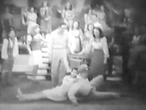 映画は床屋の娘ペギーがお客のヒゲを剃りながらタップを踏む場面から始まります。ペギーを中心にした学園ドラマなので当然学生達がショーを作ろうよ!という展開になります。リハーサル・ホールに折り畳み式の椅子を運んできた家具屋のオヤジがその椅子を使ってリズミカルな音を出すと急に音楽がかかります。ナンバーが始まるとペギーが家具屋のオヤジとタップを踏みます。このオヤジが振付師のルイ・ダプロンで、テーブル上に飛び移りスライドの振りでタップを見せてくれます。ジルバが出て来て転んでフィニッシュ、といういつものパターンで終わります。