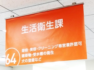 入手方法を調べたところ区役所の生活衛生課で配付されていることが分かったので、スタジオの発表会でもお世話になったことがある戸塚区総合庁舎に行ってきました。庁舎内はフロアごとに色分けされていて、生活衛生課がある6階はオレンジ系の配色でした。担当の64番窓口で事情を説明すると、何の手続きもなく2種類のプレートを2枚ずつ無料で配付してくれました。