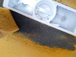 天井全面を貼り付ける本格的なDIYの修理方法をYouTubeで見たら、とんでもない大作業でとても無理なので、取り敢えずルームランプ周りだけ貼りました。