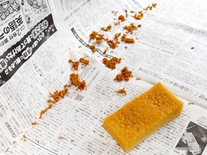 @後席を新聞紙で養生して、加水分解してボソボソになったポリウレタン接着剤をスポンジで剥がし落とす
