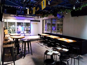 のとてもおしゃれな雰囲気に合わせて、ロゴはステージのセンターにドーンじゃなくて、ジュエリーショップやカフェバーみたいな小洒落た感じを醸し出すために、上手(客席から見て右側)に小ぶりなサイズをさり気なく掲げることにしました。