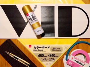 黄色のカラーボード/ゴールドのカラースプレー/硬質スポンジ/両面テープなど