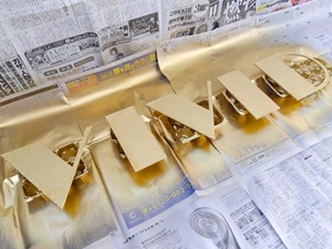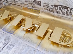なぜ黄色のカラーボードにしたかというと、下塗り無しでも塗装するゴールドの発色を少しでも良くするためです。赤いボードもあったんですが、ソレだとゴールドの赤みが強くなってローズゴールドっぽくなってしまうおそれがあるのでやめました。まあ、ソレはそれでおしゃれかもしれないので、機会があったら試してみます。