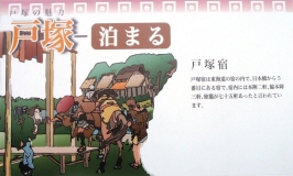 スタジオ近くの国道1号沿いで法面(のりめん)防災対策工事が実施されています。ちなみに法面とは、道路建設や宅地造成などに伴う地山掘削や盛土などによって形成された人工的な斜面のことです。もし当該の法面が地震で崩落し、東京と大阪を繋ぐ国道1号が寸断されてしまったら、救援物資を始めとするあらゆる物流が麻痺してしまうことから、いの一番に工事が着手されたようです。その工事現場に高さ4、5メール、長さ150メートル程の白い防護壁が設置されていて、先日の大雪の時はまさに白い世界になりました。最近になって、その白い壁に「戸塚の魅力」と題し、歌川広重作「東海道五拾三次之内戸塚」になぞらえて4つのカテゴリ紹介が描かれました。旧東海道をほぼ踏襲したルートの国道1号沿いにこれらを描くアイデアを提案された担当者の方は洒落ています。