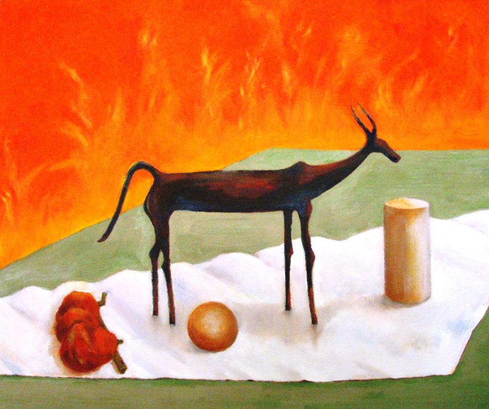 戸塚スタジオ火曜クラスの関口昭夫さんが油彩画を描いてくれました。テーブルの緑と背景のオレンジの組み合わせが灼熱のサバンナを思わせてくれて素敵です。