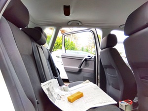 @後席を新聞紙で養生して、加水分解してボソボソになったポリウレタン接着剤をスポンジで剥がし落とす
