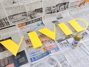 Y'sの初ライブ「VIVID」を少しでもオシャレに演出しようと思い、ステージに「VIVID」のロゴを装飾することを先生に提案したら「別にかまわないけど1000円以下で」と、なんともドライなOKとシビアな条件が出たので、見栄えがしつつコスパ最優先で作ってみました。
